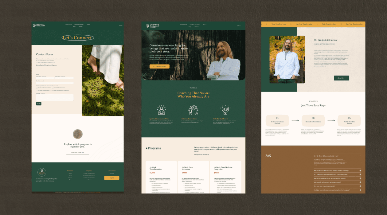 Grain of Thought needed a brand that matched its premium consciousness coaching —authentic, strategic, and conversion-focused without the sales pitch. Through collaborative iteration, I built a cohesive voice and visual system that educates visitors on core values while guiding them seamlessly toward enrollment.